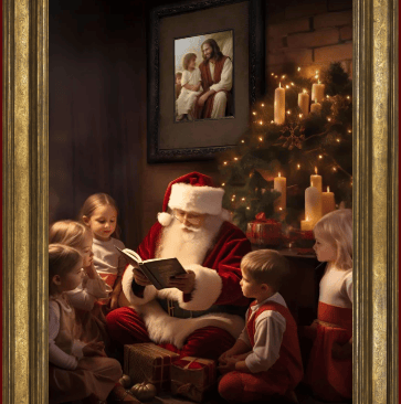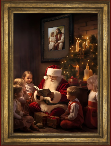 Suitable for framing. 16 X 20 inch. poster of Santa teaching children about the true meaning of Christmas. There is a picture hanging in the background of the Savior with a young child.